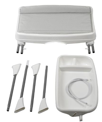Conteúdo da embalagem: 01 banheira e 01 trocador, suporte com pernas removíveis, 01 bandeja porta-objetos, 01 mangueira para escoamento da água, 01 gancho para guardar e 01 assento redutor de profundidade