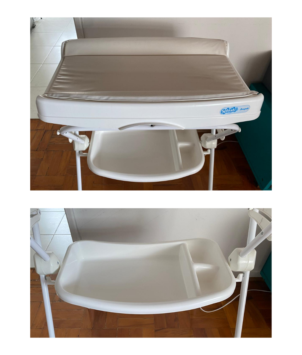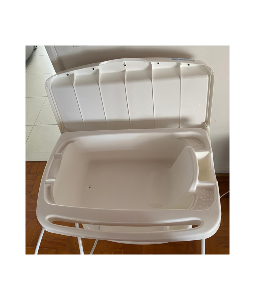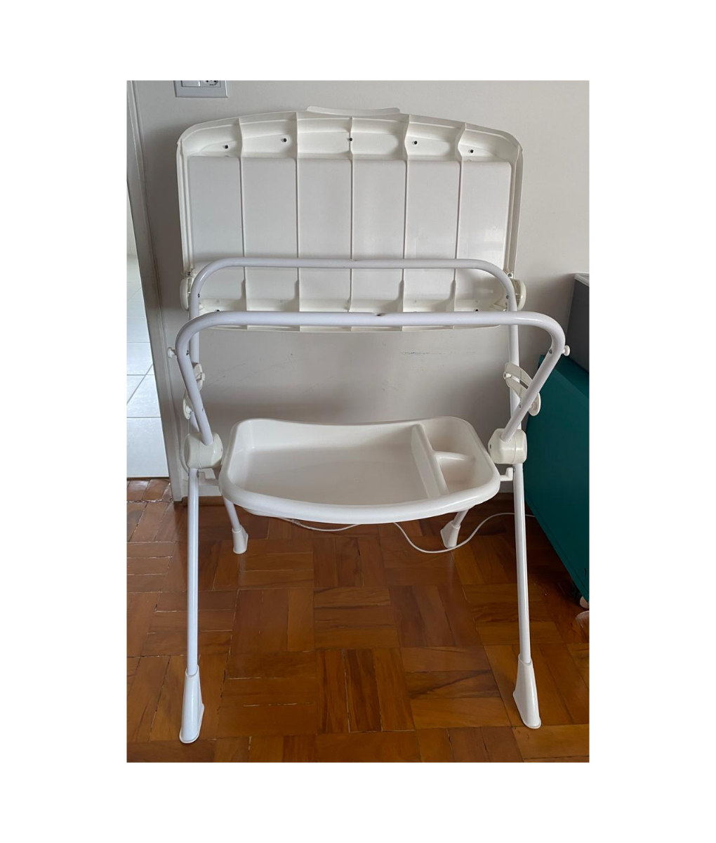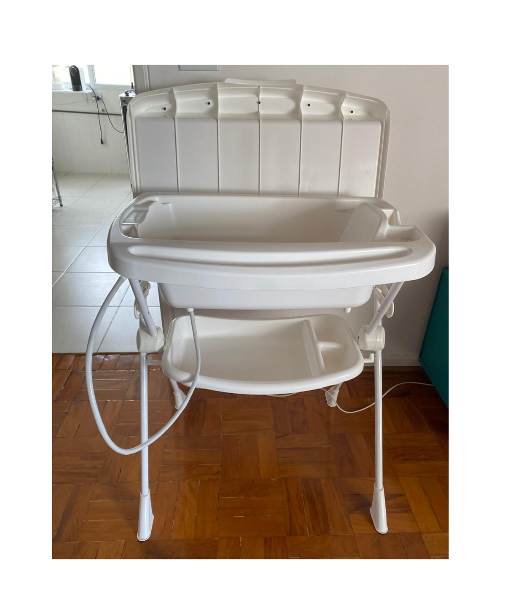 Conteúdo da embalagem: 01 banheira e 01 trocador, suporte com pernas removíveis, 01 bandeja porta-objetos, 01 mangueira para escoamento da água, 01 gancho para guardar e 01 assento redutor de profundidade
